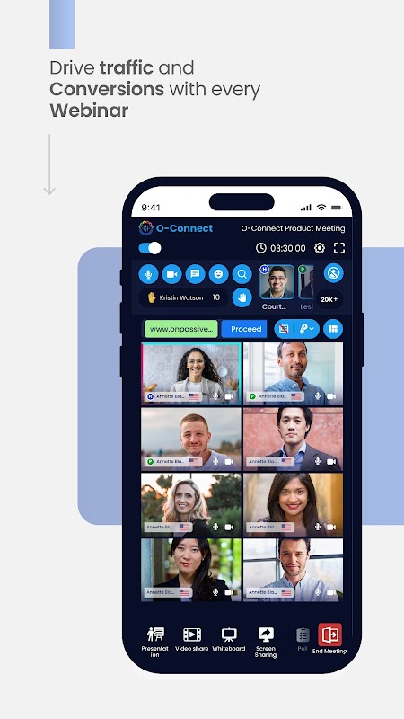 আপনি আপনার পরিচিতিদের কল করতে পারেন এবং আপনার প্রয়োজন অনুযায়ী তাদের অডিও বা ভিডিও কলে নিযুক্ত করতে পারেন। O-Connect চমৎকার অডিও কোয়ালিটি এবং UHD ভিডিও কোয়ালিটি প্রদান করে। ওয়েবিনার এবং ওয়েব কনফারেন্সের জন্য ও-কানেক্ট হল সেরা টুল।