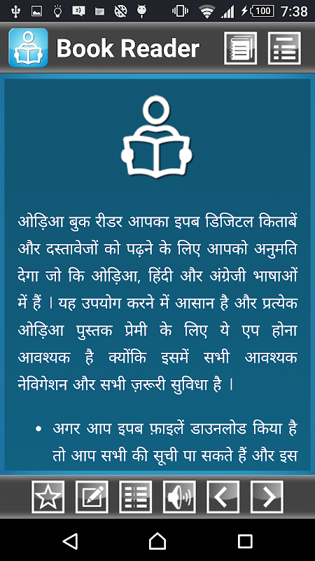 Odia বুক রিডার আপনি Odia, হিন্দি ও ইংরেজি ভাষায় যা আপনার ePub ডিজিটাল বই এবং নথি পড়া করার অনুমতি দেবে. এটি ব্যবহার করা সহজ এবং এটা সব প্রয়োজনীয় navigations এবং প্রয়োজনীয় সকল বৈশিষ্ট্য আছে, কারণ প্রতিটি Odia বইয়ের লাভার জন্য অ্যাপ্লিকেশন উপস্থিত থাকা আবশ্যক.