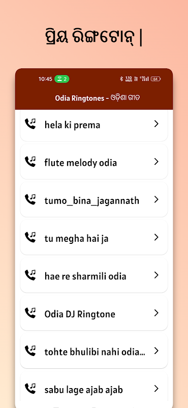 🔔 কাস্টমাইজযোগ্য রিংটোন: ওডিয়া মিউজিকের মনোমুগ্ধকর শব্দের সাথে আপনার ডিভাইসকে ব্যক্তিগতকৃত করুন। আপনার প্রিয় ওডিয়া টিউনগুলিকে রিংটোন, অ্যালার্ম বা বিজ্ঞপ্তি হিসাবে সেট করুন, আপনার দৈনন্দিন জীবনকে উড়িষ্যার সঙ্গীত ঐতিহ্যের সুরেলা আকর্ষণের সাথে মিশ্রিত করুন।
