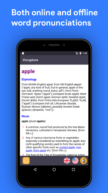 Vocapture হল Android এর জন্য সবচেয়ে শক্তিশালী এবং সহজেই ব্যবহারযোগ্য ইংরেজি অভিধান অ্যাপ। ইংরেজি উইকশনারি থেকে 800,000-এর বেশি সংজ্ঞা সহ, Vocapture আপনাকে যে কোনো সময়, যে কোনো জায়গায় ইংরেজি শব্দভান্ডার অন্বেষণ, শিখতে এবং অনুশীলন করতে সাহায্য করে। এটি সম্পূর্ণরূপে অফলাইনে কাজ করে, তাই আপনার ইন্টারনেট সংযোগের প্রয়োজন নেই৷