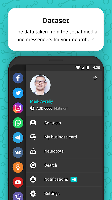 • OLPORTAL Account - bind your social media and messengers to your OLAccount in order to use your own DataSet for the formation of neurobots.