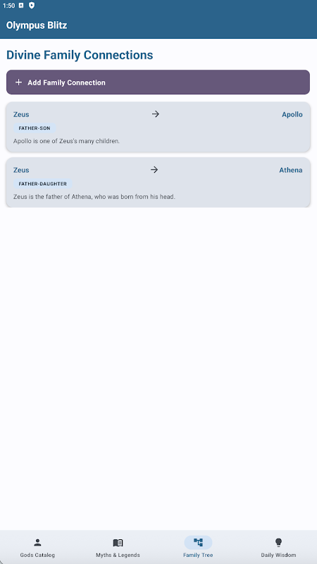 Explore the rich world of Greek mythology with this interactive mobile companion. Discover fascinating stories about gods, goddesses, and legendary heroes from ancient Greece. Browse through detailed profiles of divine beings, each with their domains, symbols, and mythological backgrounds. Read captivating myths and legends, bookmark your favorites, and learn timeless moral lessons. Explore complex family relationships between deities with detailed genealogical connections. Enjoy daily mythological facts, trivia, and wisdom to expand your knowledge. Track your learning progress with achievement badges and reading milestones. Add your own entries, notes, and discoveries to personalize your mythological journey. Experience smooth navigation and beautiful card-based design throughout the app. Perfect for mythology enthusiasts, students, and anyone curious about ancient Greek culture and stories.