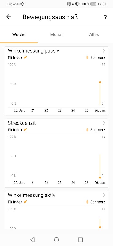 Knee - App leitet Sie zu den verschiedenen Bewegungsübungen und -tests an. Der dazugehörige Sensor erfasst Bewegungsparameter, die App analysiert diese, wertet sie aus und gibt Ihnen anschließend direkt Feedback. Diese Analysen und Auswertungen geben Rückschlüsse zu Ihrem individuellen Heilungsverlauf. Zur Evaluation werden die Messergebnisse der verletzten Seite mit der Gegenseite verglichen – dieser Wert wird Ihnen in der App als Fit-Index dargestellt und kann mit weiteren Angaben in der Verlaufsanalyse den Therapieverlauf klarer und objektiver darstellen. International wird hier vom Limb Symetrie Index (LSI) gesprochen. Der Fit-Index bzw. LSI kann auch noch in Unterkategorien weiter analalysiert werden, welche dann in unterschiedlichen Farben pro Kategorie dargestellt werden. Das integrierte Rehabilitations- und Übungsprogramm unterstützt Sie, sich insgesamt und speziell in einzelnen Bewegungskategorien