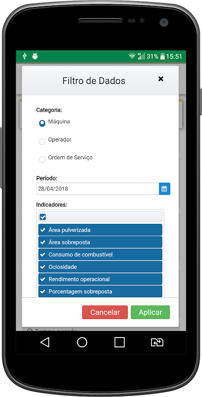 • Indicators - Check the operations performed by a Jacto engine, with information of how this was achieved, coverage and overlap spraying.