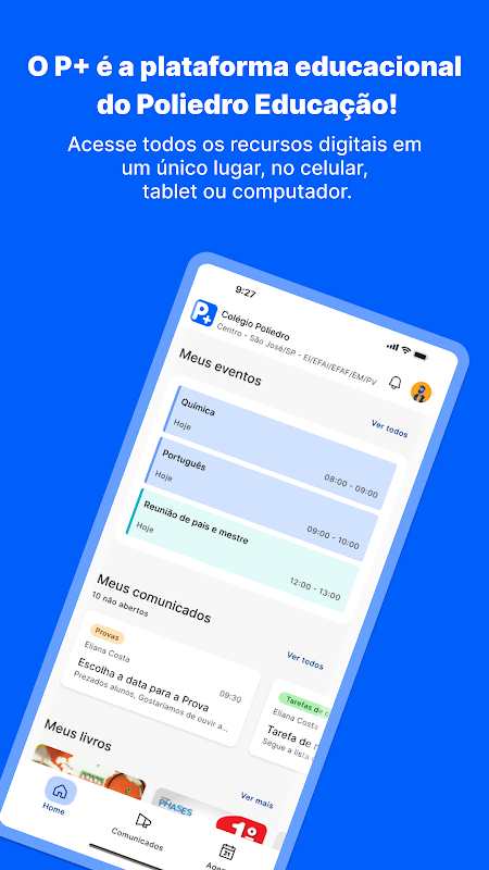 P+ হল Poliedro Educação-এর ডিজিটাল প্ল্যাটফর্ম যেখানে শিক্ষা ব্যবস্থার সাথে যুক্ত স্কুলগুলির সমস্ত ডিজিটাল সংস্থান এবং সরঞ্জামগুলিতে অ্যাক্সেস রয়েছে।