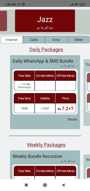 1): প্যাকেজ সম্পর্কিত তথ্য যেমন খরচ, সময়, বিনামূল্যে এমবি'র বিশদ, সামাজিক এমবি'র বিবরণ