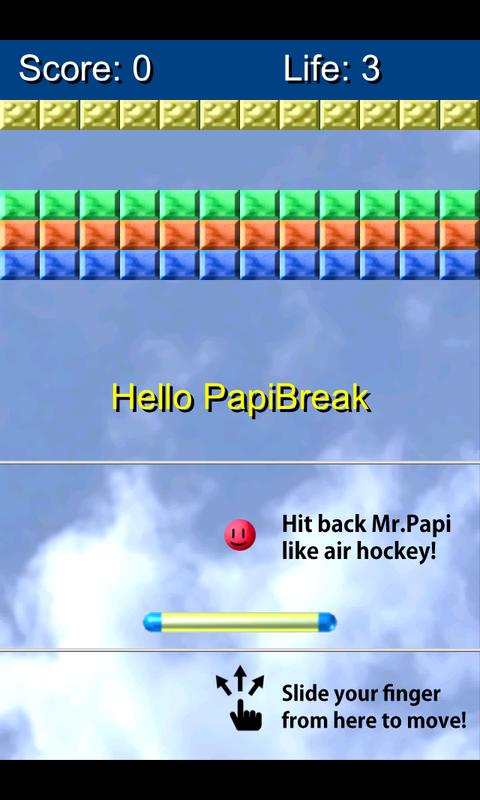 Slide your finger on the screen to control a paddle. Hit back a red ball (Mr.Papi) with the paddle, and break all the blocks.