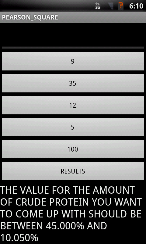This is a very simple app that will enable you come up with a certain amount of food for your animals for example you may want to give your animal 35% protein but you may not be knowing how to mix the different ingredients to come up with the 35% proteins.So this app helps you in such problems. even when you have gotten 4 ingredients and you a looking for a way to mix them to get a certain amount of for example proteins this app can give you the values you need. all you have to do is to input the percentage amount of the different feeds and their crude protein values and you will obtain answers by clicking on certain buttons.