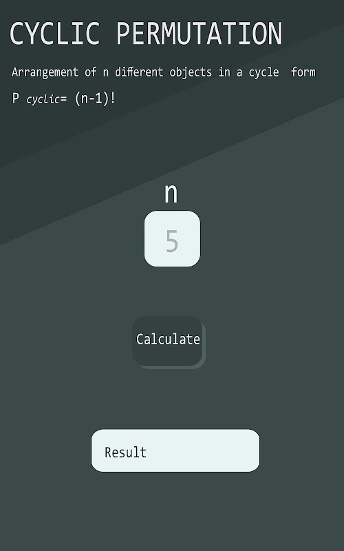 পারমুটেশন, সাইক্লিক পারমুটেশন, কম্বিনেশন এবং মাল্টিসেটের গণনার ফলাফল পান। শুধু n এবং r লিখুন তারপর এক স্পর্শে ফলাফল পান।