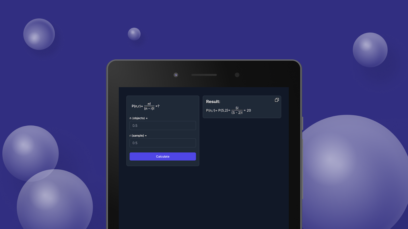 3. **অফলাইন সক্ষমতা**: একটি সক্রিয় ইন্টারনেট সংযোগের প্রয়োজন নেই - যেকোন জায়গায়, যে কোনো সময় পারমিউটেশন গণনা করুন।