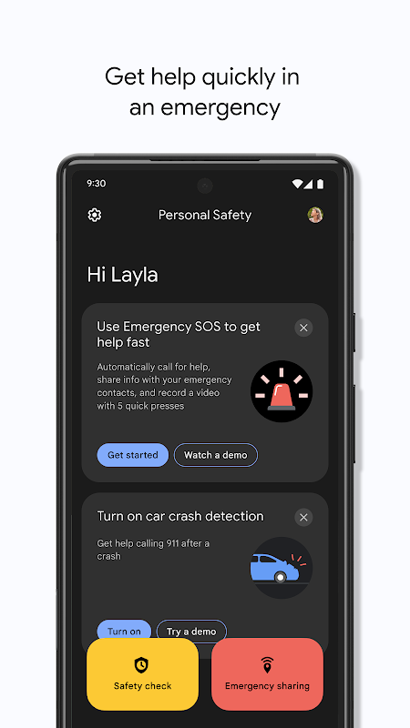 On Pixel Watch• Now available: Fall Detection, Emergency SOS, Emergency Sharing, Safety Check, and more