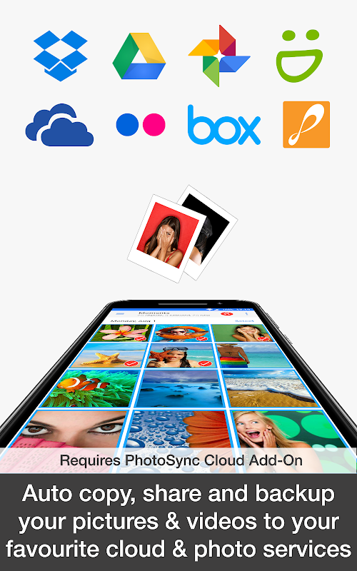 • নিরাপদে স্বয়ংক্রিয়ভাবে কপি করুন, শেয়ার করুন এবং আপনার ফটো এবং ভিডিওগুলি সরাসরি আপনার Android ফোন/ট্যাবলেট থেকে আপনার প্রিয় ক্লাউড এবং ফটো পরিষেবাগুলিতে WiFi এবং সেলুলার নেটওয়ার্কের মাধ্যমে ব্যাকআপ করুন৷ (ফটোসিঙ্ক ক্লাউড অ্যাড-অন প্রয়োজন - ড্রপবক্স, গুগল ড্রাইভ, গুগল ফটো, ফ্লিকার, ওয়ানড্রাইভ, স্মাগমগ, বক্স, জেনফোলিও এবং ফটোপ্রিজম সমর্থিত!)