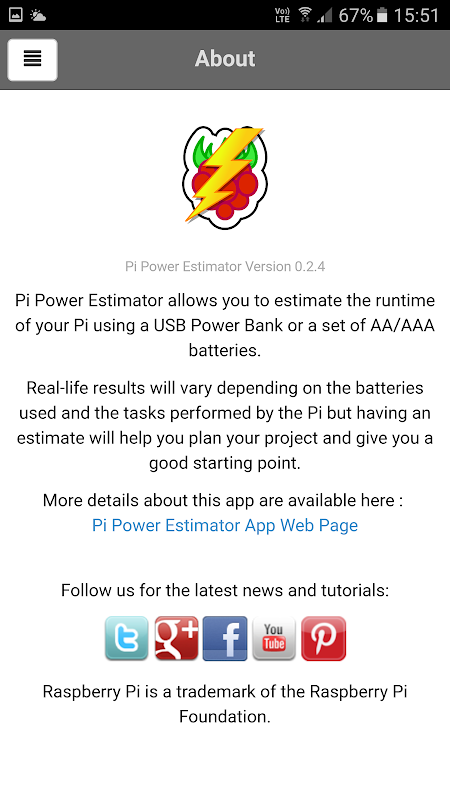 এই অ্যাপ্লিকেশনটিতে কোনও বিজ্ঞাপন নেই তবে এতে রাস্পবেরিপিএসপি.কম.উইক এবং আমার সামাজিক মিডিয়া চ্যানেলগুলির কিছু স্পষ্টভাবে বর্ণিত লিঙ্ক রয়েছে contain এগুলি সরাসরি রাস্পবেরি পাই সম্পর্কিত।