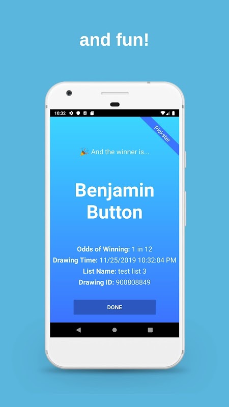 • নতুন স্ক্রিন শট বান্ধব বিজয়ী পৃষ্ঠা! এখন আপনি সবাইকে কিছুটা ধুমধাম করে অঙ্কনের ফলাফল এবং তালিকার প্রত্যেকের নাম প্রদর্শন না করে দেখাতে পারবেন। একবারে একটি নাম আঁকলে সেটিংস পৃষ্ঠাতে প্রতি তালিকাতে এটি স্যুইচ করুন।