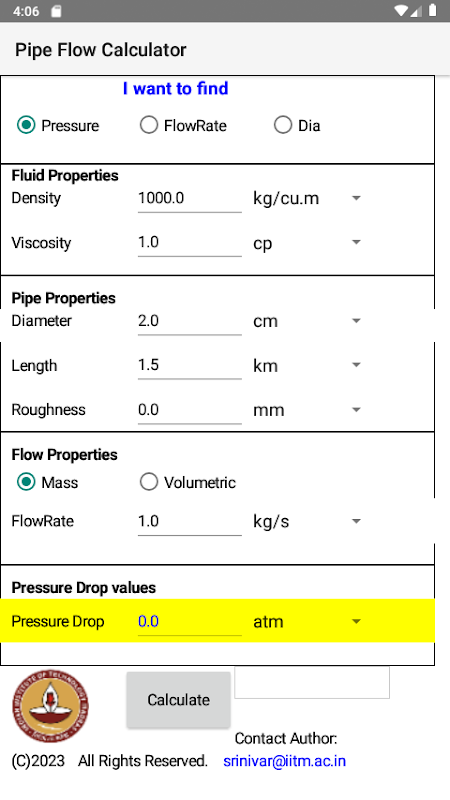 এই অ্যাপটি চাপের ড্রপ বা প্রবাহের হার বা পাইপের ব্যাস গণনা করতে পারে