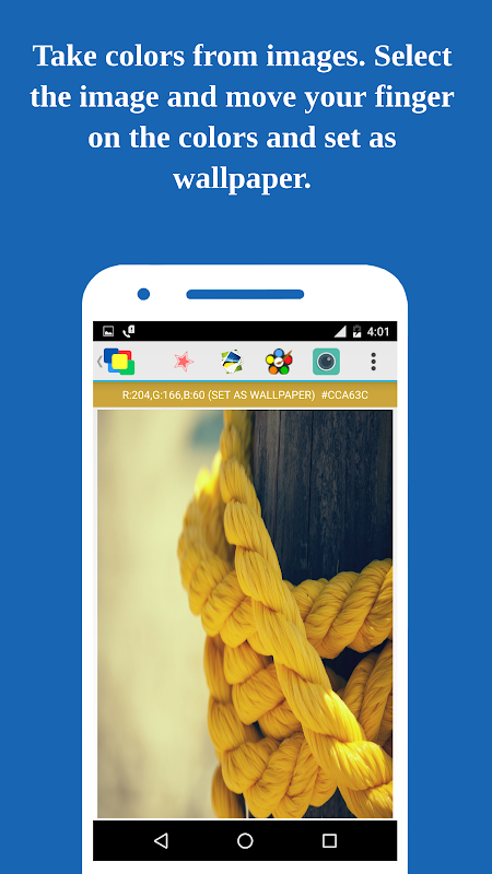 এই অ্যাপ্লিকেশনটি ব্যবহার করে আপনি আপনার মোবাইল রঙের ওয়ালপেপারগুলির সাথে আপনার ড্রেসিংয়ের রঙগুলি মেলাতে পারেন। ভ্রমণের সময় আপনি যে কোনও ছবি তুলতে এবং এটি থেকে রঙ নিতে পারেন। গ্রাফিক্স ডিজাইনারদের জন্য এই অ্যাপ্লিকেশনটি সহজেই রঙের কোড সরবরাহ করে। ডিফল্ট লক্ষ লক্ষ সলিড সাদামাটা রঙের ওয়ালপেপার সরবরাহ করেছে।