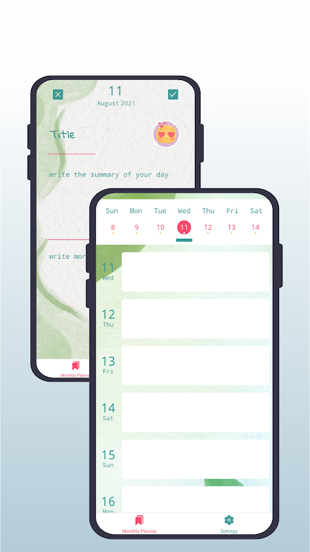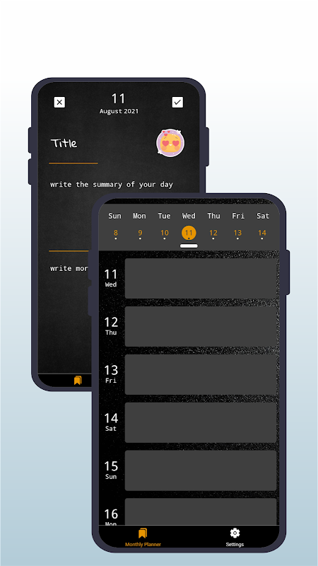 একটি ক্যালেন্ডার যেখানে আপনি প্রতিদিন যা চান তা লিখতে পারেন। আপনার দিন সম্পর্কে লেখার পাশাপাশি, আপনার মেজাজ প্রকাশ করার জন্য আপনার কাছে 12টি ইমোজি বিকল্পও থাকবে।