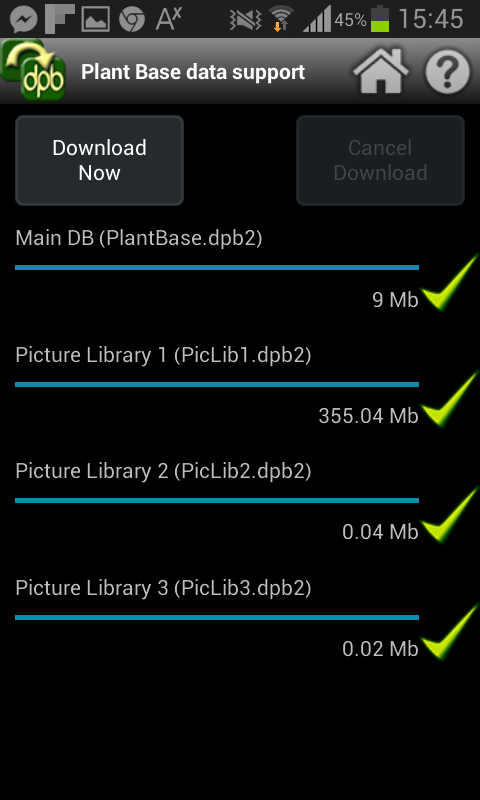 1 - উদ্ভিদ বেস জন্য ডাটাবেস ফাইল ডাউনলোড প্রারম্ভিক ইনস্টলেশনের বা আপডেটের জন্য. সামনে বা প্রধান অ্যাপ্লিকেশন ইনস্টল করার পরে চালানো যেতে পারে. ফাইল বড় হয় এবং একটি ভাল ইন্টারনেট সংযোগ প্রয়োজন বোধ করা হয়. তারা একটি PlantBase ডিরেক্টরি, যা প্রয়োজনে সৃষ্টি হবে সংরক্ষণ করা হয়.