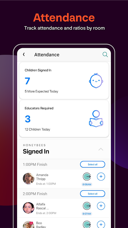 উপস্থিতি - রুম অনুসারে উপস্থিতি এবং অনুপাত ট্র্যাক করুন। আপনি শিক্ষাবিদ-শিশু অনুপাত পূরণ করছেন তা নিশ্চিত করতে কতজন শিশু সাইন ইন/বুক করা হয়েছে তা দেখুন।