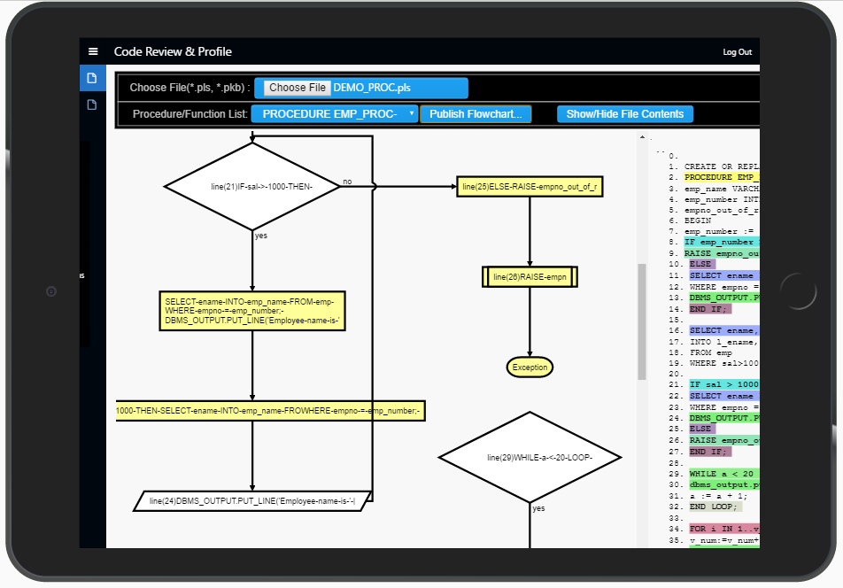 এই অ্যাপ্লিকেশন ব্যবহারকারীদের একটি ফ্লোচার্ট যেমন PLSQL সোর্স কোড দেখতে সাহায্য করে