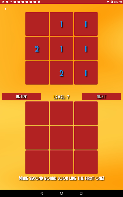 - When you hold down a tile you can see how the nearby tiles will change. Your goal is to make the lower board exactly like the top one