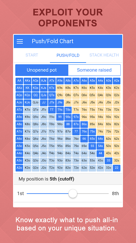 It shows you what hands to go all-in and what hands to fold depending on your stack size, blinds, ante and number of players in a no limit Holdem poker tournament. Using a complicated set of formulas, Poker Hacker calculates the optimal push-fold strategy based on your current situation and your M-Ratio.