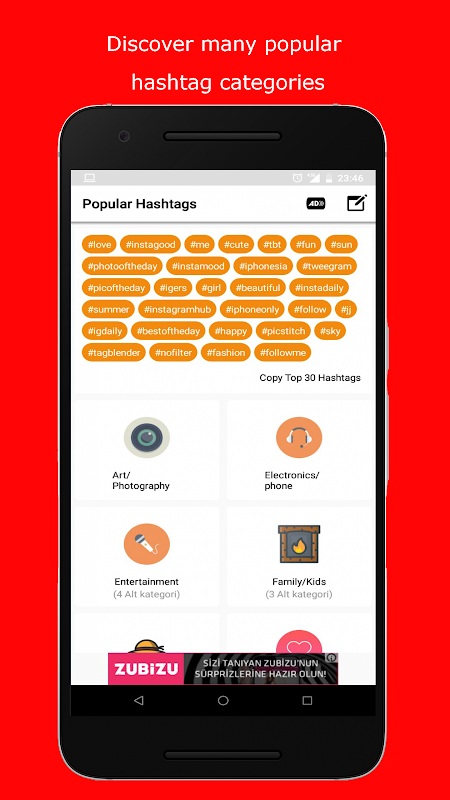2018 Popular Hashtags mix - get instagram followers and likes so easly. Popular hashtags app will help you to increase "likes" of your photos, and help to get instagram followers. Just copy and paste necessary hashtags. You can edit hashtags and add to your own hashtag set list. Also you can create your own hashtag sets. Popular hashtags. Hashtags Instagram. Use 2018 popular hashtags for instagram and get likes and followers and comments. İf you want to hashtags mix - get instagram followers than you find your app. Best hashtags mix - get instagram followers. Best way to get instagram followers is the downloading that hashtags mix - get instagram followers. Use popular hashtags and hashtags mix - get instagram followers. 2018 popular hashtags for instagram. Top hashtags are here.HashTags app provide for you many hashtag categories as: Sports, Popular, Entertainment, Animals, Fashion, Social, TextArt, Weather/Seasons, Celebrities, Food