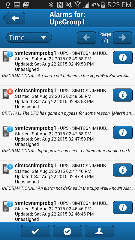 The “All Alarms” button allows users to view alarms for all groups and members, as well as those not associated with a group in PredictPulse. It displays 100 alarms per page, sortable by device, severity and time. Users can also tap the information button next to the alarm for additional details. Critical alarms will be acknowledged by Eaton and will list who is assigned to resolve the event.