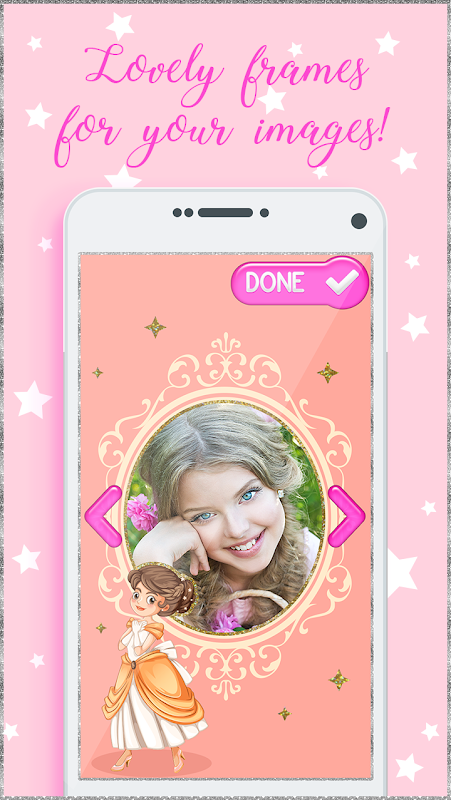 Girls, the latest frames for pictures are here! Add đâPrincess Photo Framesâđ to every selfie you take! Download the kawaii editor, browse through the gallery full of princess âbirthday framesâ, and combine them with your pics! Make a perfect fashion âphoto montageâ with the help of the cute photo editor for girls! Take tons of pictures with the fashion photo camera and turn them into a frames collage! Have one of the best âbeauty cameraâ apps on your device! Enter the virtual kawaii photo booth to find incredible frames for pictures with effects, glitter photo frames, birthday photo frame princess, and many other âgirl framesâ! With the selfie camera 2018, you can give your pictures a completely new look. Have the prettiest selfies thanks to the princess photo editor! Play with numerous pretty photo glitter frames and frames for birthday!