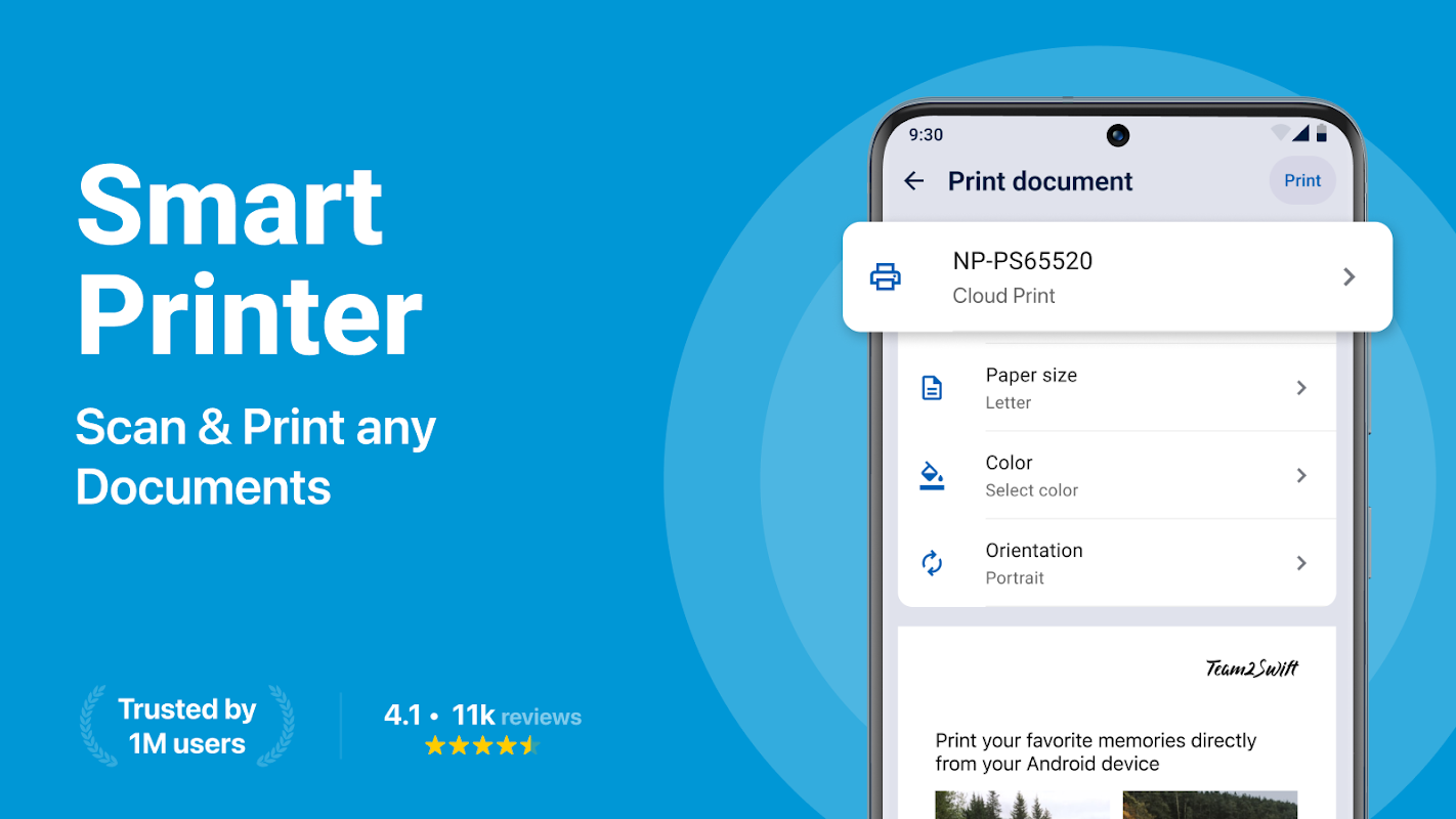 শুধুমাত্র একটি ট্যাপ দিয়ে নথি, ছবি এবং ছবি প্রিন্ট করুন। আপনার সঞ্চয়স্থান থেকে ফাইলগুলি নির্বাচন করুন বা অবিলম্বে সেগুলি স্ক্যান করুন, তারপরে আপনার Wi-Fi, ব্লুটুথ বা ওয়্যারলেস এয়ারপ্রিন্ট-সক্ষম প্রিন্টারের সাথে সংযোগ করুন — কোনো জটিল সেটআপের প্রয়োজন নেই৷ PDF, Word নথি, ছবি এবং আরও অনেক কিছু সমর্থন করে।