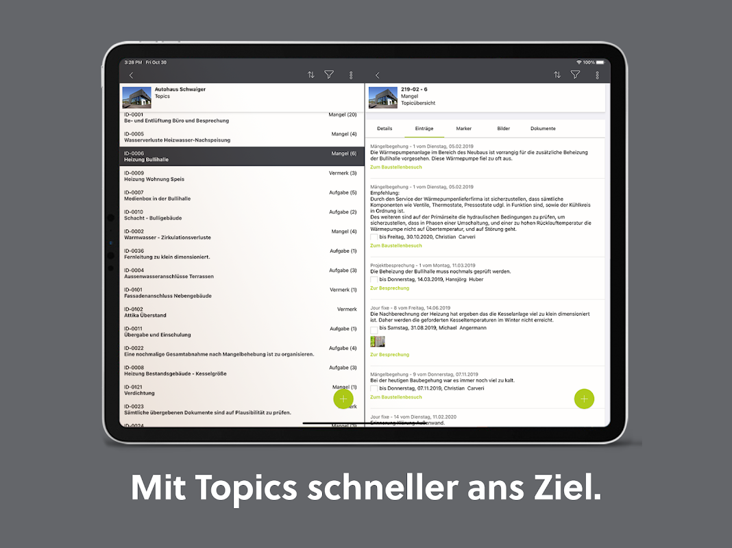 সভা এবং অনলাইন সভাগুলি কয়েকটি ক্লিকের সাথে সজ্জিত। নির্মাণের ডায়েরি এবং লগগুলি 'বিষয়গুলি' আপডেট করে স্বয়ংক্রিয়ভাবে আপডেট হয়।