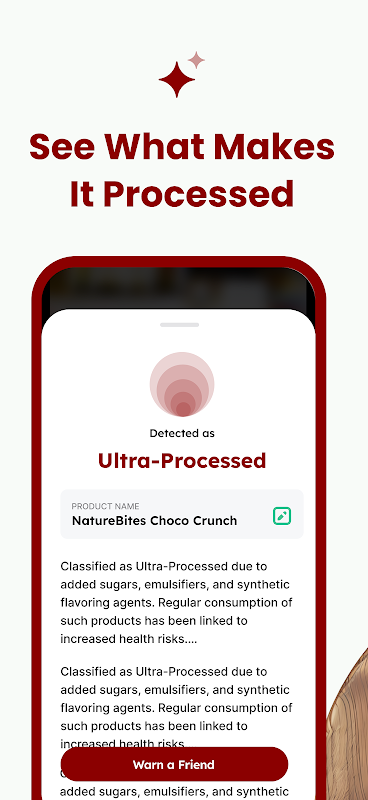 প্রসেসডের মাধ্যমে, আপনি যে খাবারটি খাচ্ছেন তা তৈরিতে তাৎক্ষণিক স্বচ্ছতা পান। আমাদের অত্যাধুনিক AI উপাদানগুলি বিশ্লেষণ করে এবং সেগুলিকে আপনার জন্য সহজভাবে বোঝার বিন্যাসে এবং হাইলাইট করে যদি সেগুলি আল্ট্রা-প্রসেসড বিভাগের অধীনে পড়ে।