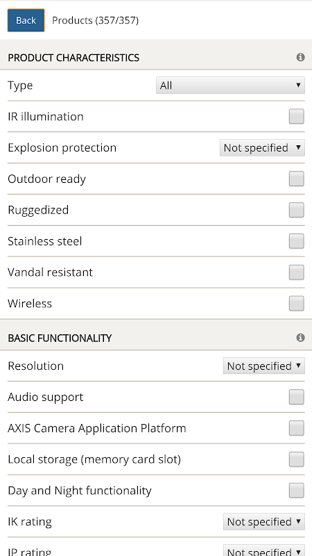 Axis product selector includes Axis entire range of network cameras and video encoders. When online, the application updates itself with the latest product information. When offline, you have access to downloaded data.