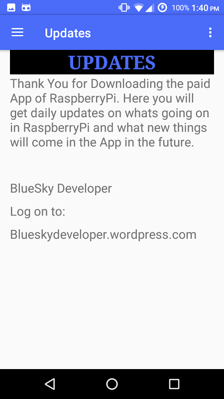 এই সমস্ত বৈশিষ্ট্য সঙ্গে একটি অ্যাপ্লিকেশন. ভাল কন্টেন্ট এবং মসৃণ অভিজ্ঞতা সঙ্গে ব্যবহারকারী বন্ধুত্বপূর্ণ UI 'তে উপভোগ করুন. অ্যাপ সামার প্রকল্প আইডিয়াস এবং দৈনন্দিন RaspberryPi আপডেট মত যোগ নতুন কন্টেন্ট সঙ্গে বিনামূল্যে অ্যাপ্লিকেশন হিসাবে সব বৈশিষ্ট্য আছে.