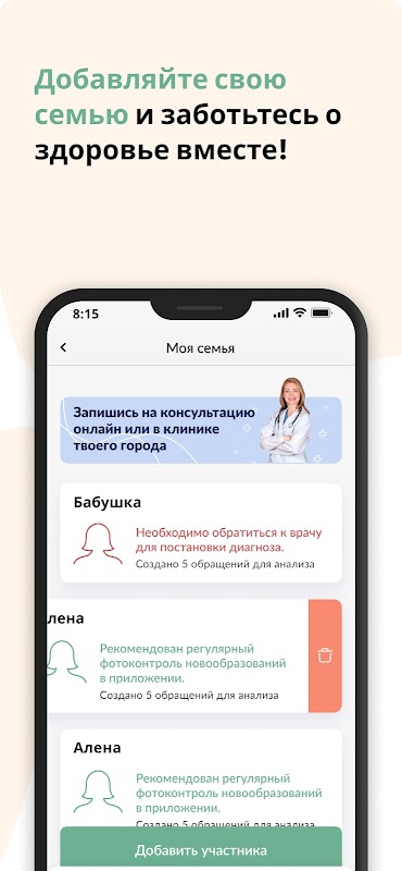 এটি আপনাকে আপনার গ্যালারি থেকে একটি ছবি নির্বাচন করতে বা আপনার স্মার্টফোনের ক্যামেরা দিয়ে সন্দেহজনক আঁচিলের একটি ছবি তুলতে এবং শরীরে এর অবস্থান এবং এটি কখন দেখা দিয়েছে সে সম্পর্কে অতিরিক্ত তথ্য প্রদান করতে অনুরোধ করে।