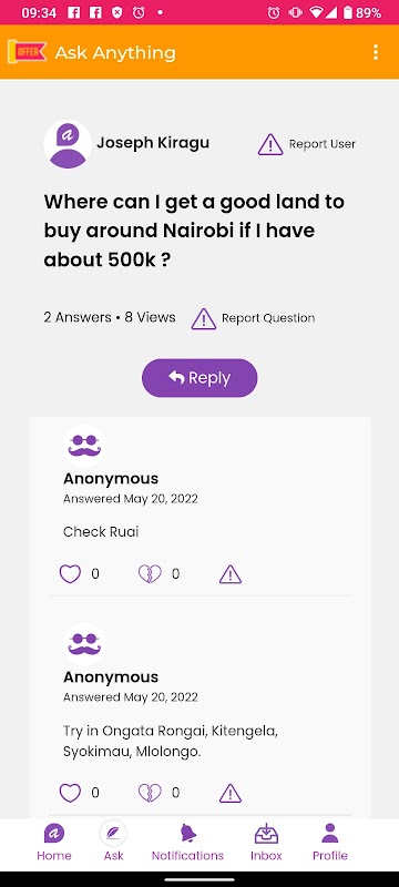 Ask Anything প্ল্যাটফর্ম হল যেখানে আপনি স্বাস্থ্য, শিক্ষা, বিনোদন, ফ্যাশন, কৃষি ইত্যাদি বিষয়ে বেনামে যেকোন বিষয়ে লোকেদের জিজ্ঞাসা করতে পারেন। আপনি প্রতিক্রিয়া পাওয়ার সময় বা খোলাখুলি জিজ্ঞাসা করার সময় আপনার পরিচয় গোপন করতে পারেন। লোকেদের তাদের প্রশ্নের উত্তর দিয়ে সাহায্য করুন বা আপনার প্রশ্ন জিজ্ঞাসা করুন।