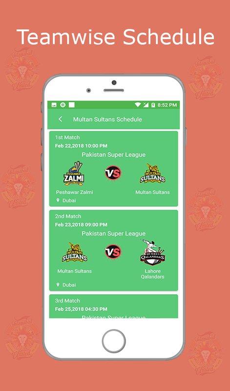 ✅ Team Wise Schedule like teams Peshawar Zalmi, Quetta Gladiators, Lahore Qalandars, Multan Sultans, Islamabad United, Karachi Kings