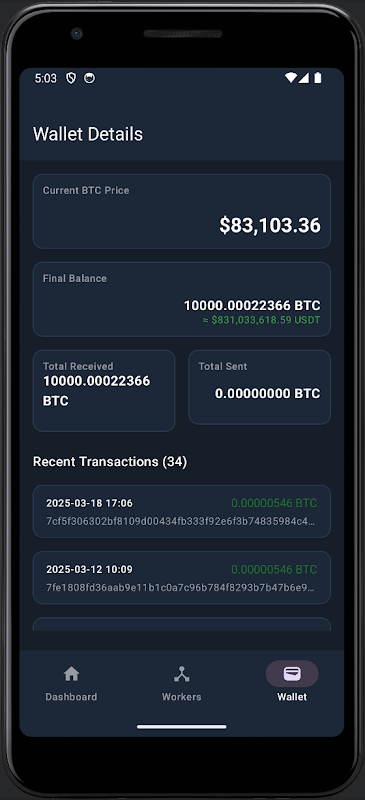 আপনার Android ডিভাইস থেকে সরাসরি পাবলিক পুলে আপনার ক্রিপ্টোকারেন্সি মাইনিং কার্যকলাপ নিরীক্ষণ করুন। যেতে যেতে আপনার হ্যাশ রেট, কর্মী এবং ওয়ালেটের বিশদ বিবরণ রাখুন।