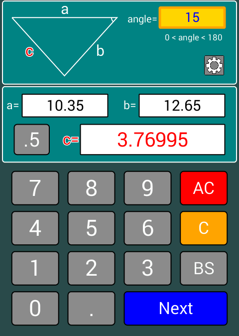 হিসাব সূত্র "c = √ (একটি ^ 2 + b ^ 2 - 2abCos (কোণ))"।