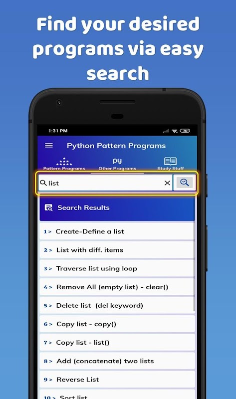 এই অ্যাপটি প্যাটার্ন এবং অন্যান্য পাইথন প্রোগ্রামগুলিতে পূর্ণ। এগুলি ছাড়াও পাইথন প্রোগ্রামিংয়ের সাথে সম্পর্কিত প্রচুর স্টাডি স্টাফ রয়েছে।