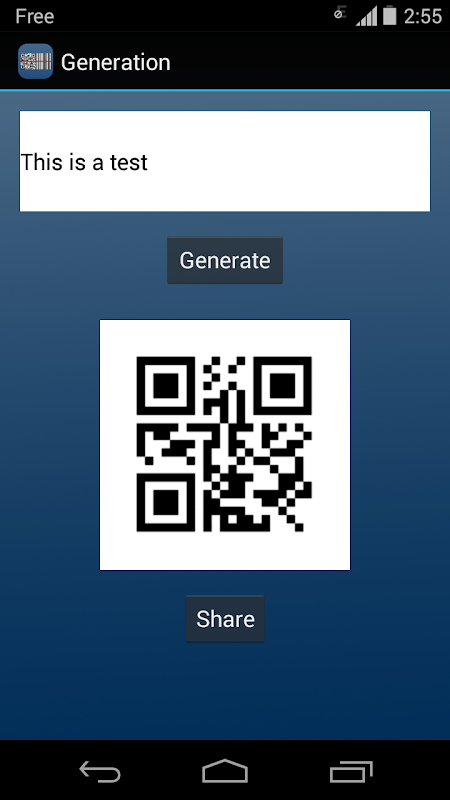 Just launch the application and then you can read any QR code or barcode. The application also provides the ability to generate a QR code from a link or text and share it to all your contacts. Finally a historic allow you to keep all scanned codes.