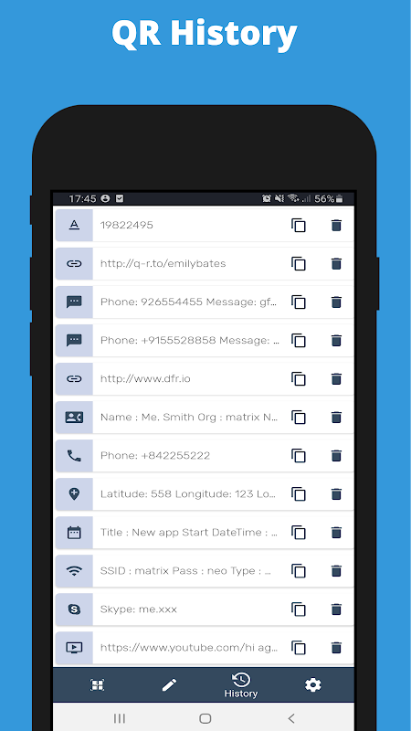 কিউআর কোডগুলি এবং বারকোডগুলি স্ক্যান করুন। আপনার নিজের কিউআর কোডগুলি তৈরি করুন। একটি ইতিহাসে কিউআর কোডগুলি সংরক্ষণ করুন