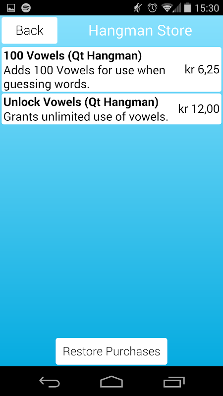 We recommend that instead of actually purchasing vowels inside this official release, download Qt and run the example from the Qt Purchasing module against your own store entry where you have registered as a test user. You will then be able to test the purchasing functionality without actually paying.