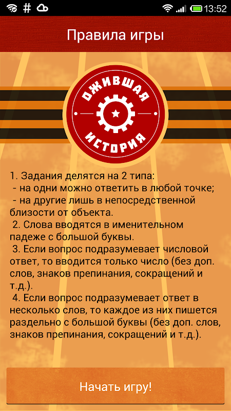 Геолокационная мобильная игра - это новый формат в стиле "Городские Игры" , с использованием мобильного телефона или планшета. Новый квест. Пройди по памятным местам Казани узнай что то новое или обнови свои знания. Соревнуйся с друзьями, проверь кто больше знает об этом городе.