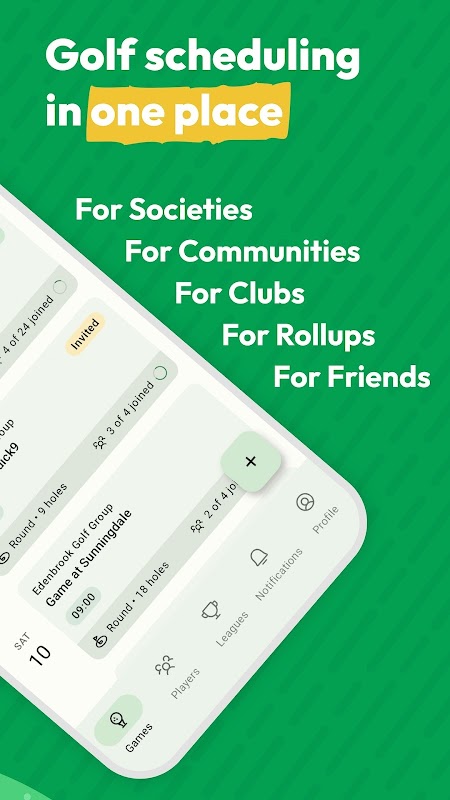* বিস্তৃত গলফ গ্রুপ ম্যানেজমেন্ট: নৈমিত্তিক 9-হোল রাউন্ড থেকে শুরু করে সম্পূর্ণ গল্ফ টুর্নামেন্ট পরিচালনা এবং লিগগুলি সহজেই সংগঠিত করুন