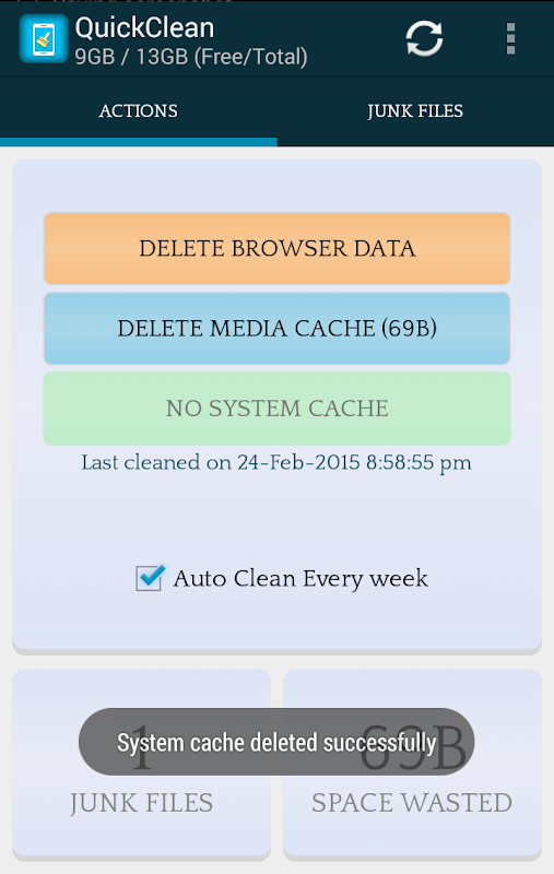 Every application you use creates cache and unwanted files which unnecessarily uses up your storage space and memory , and slows down your phone. QuickClean deletes these junk files and improves your phone's performance at the same time increasing your free storage space and memory.