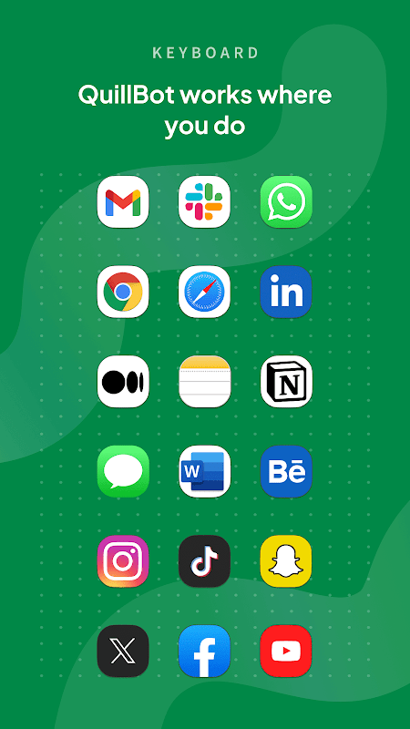 AI রাইটিং অ্যাসিস্ট্যান্ট হল একটি ফ্লোটিং উইজেট যা আপনার সমস্ত অ্যাপ জুড়ে কাজ করে, আপনাকে ভুল-মুক্ত, প্যারাফ্রেজ, অনুবাদ এবং তাৎক্ষণিকভাবে টেক্সট তৈরি করতে সাহায্য করে। সর্বোত্তম: আপনি আপনার পছন্দের কীবোর্ড রাখতে পারেন এবং আপনি যেখানে লিখবেন সেখানে QuillBot সমর্থন পেতে পারেন।