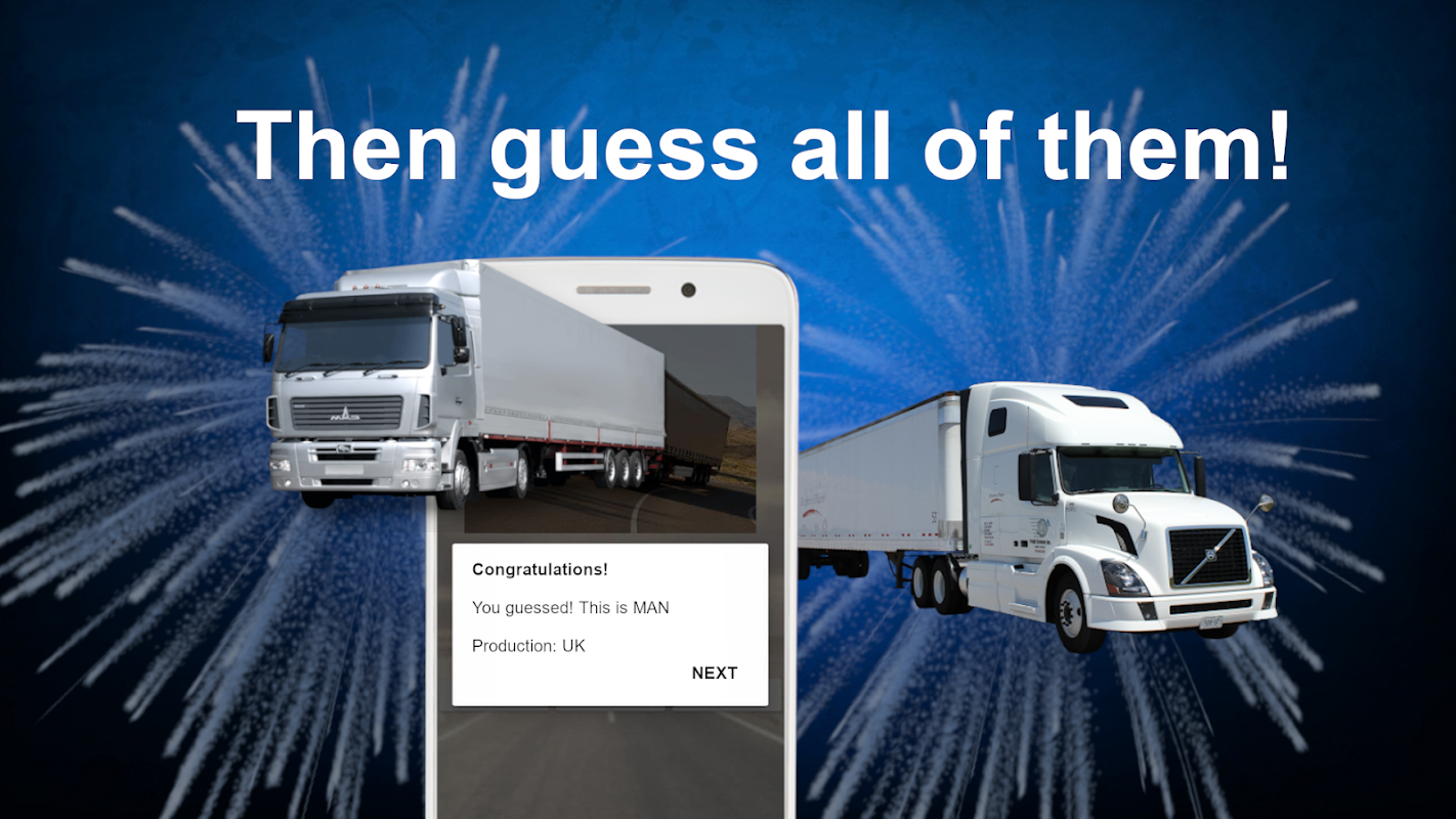এই গেমটিতে আপনার ফটো থেকে ট্রাকগুলির নাম অনুমান করা দরকার: কেবল ছবিটি দেখুন এবং ট্রাকটির নাম বানান। আপনি যদি কোনও অজানা ট্রাকটি দেখতে পান তবে আপনি ইঙ্গিতগুলি ব্যবহার করতে পারেন।