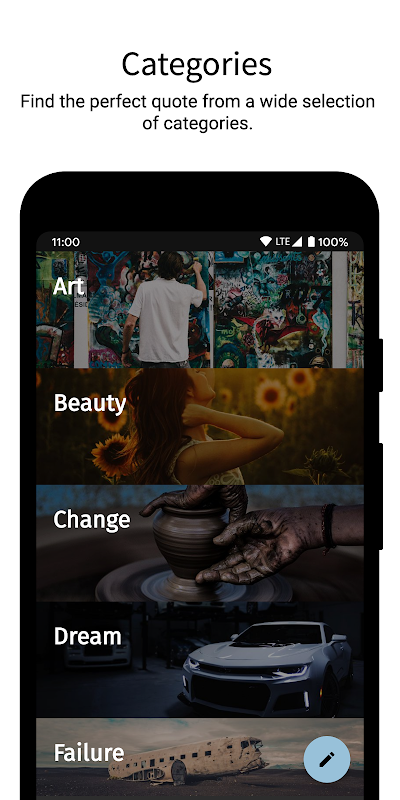 Edit any quote from our collection of 10000+ quotes inside the app. Found a quote in our collection that you like but want to change the font and the background? You can do so easily right from the app and download the new quote wallpaper created by you.