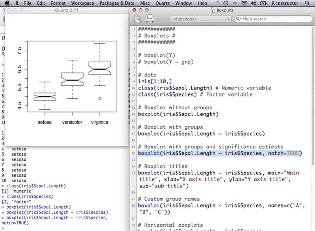 R Instructor will teach you how to use R, how to make and modify plots and run statistical tests. Each example includes a very brief (and easy to understand!) description of the function or test, any statistical assumptions, how to structure your data in R, the R scripts (code) and, links to other free and online resources.